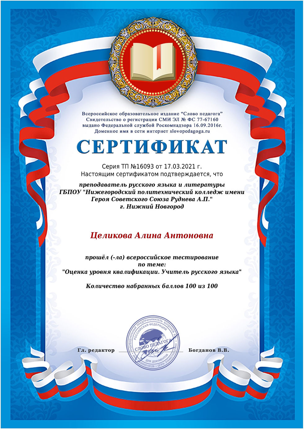 Прошла всероссийское тестирование по теме «Оценка уровня квалификации. Учитель русского языка». Количество набранных баллов 100 из 100. Сертификат Серия ТП № 16093 от 17.03.2021